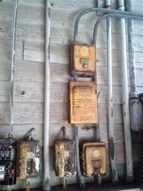A closer look inside reveals what remains of some old equipment. It also appears there was some fire damage on at least one occasion.
